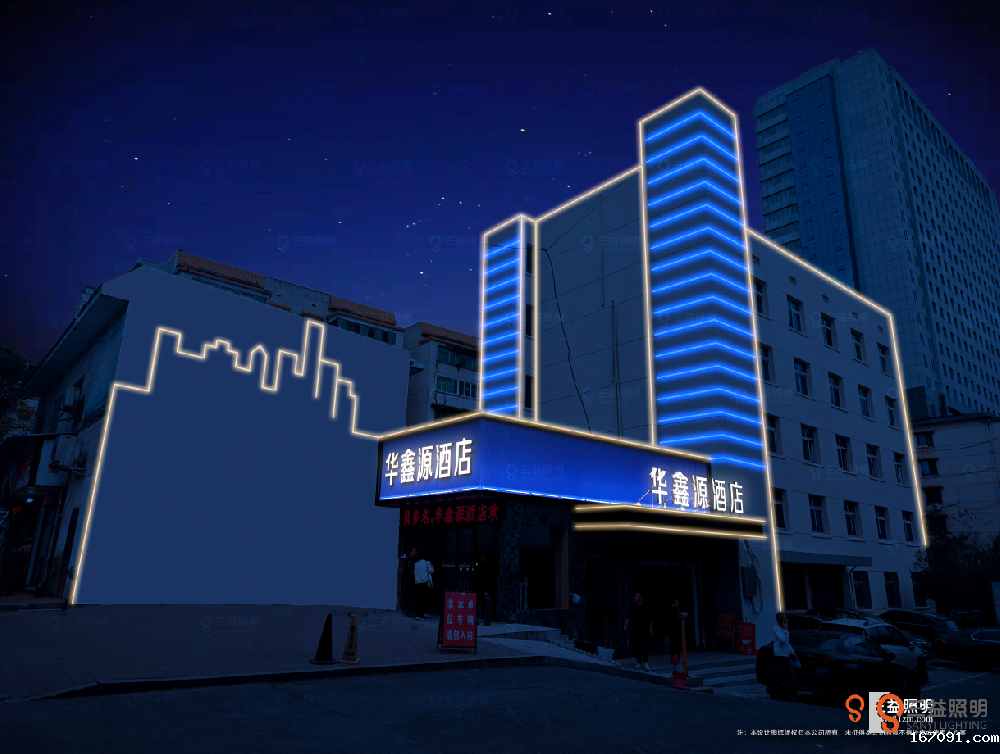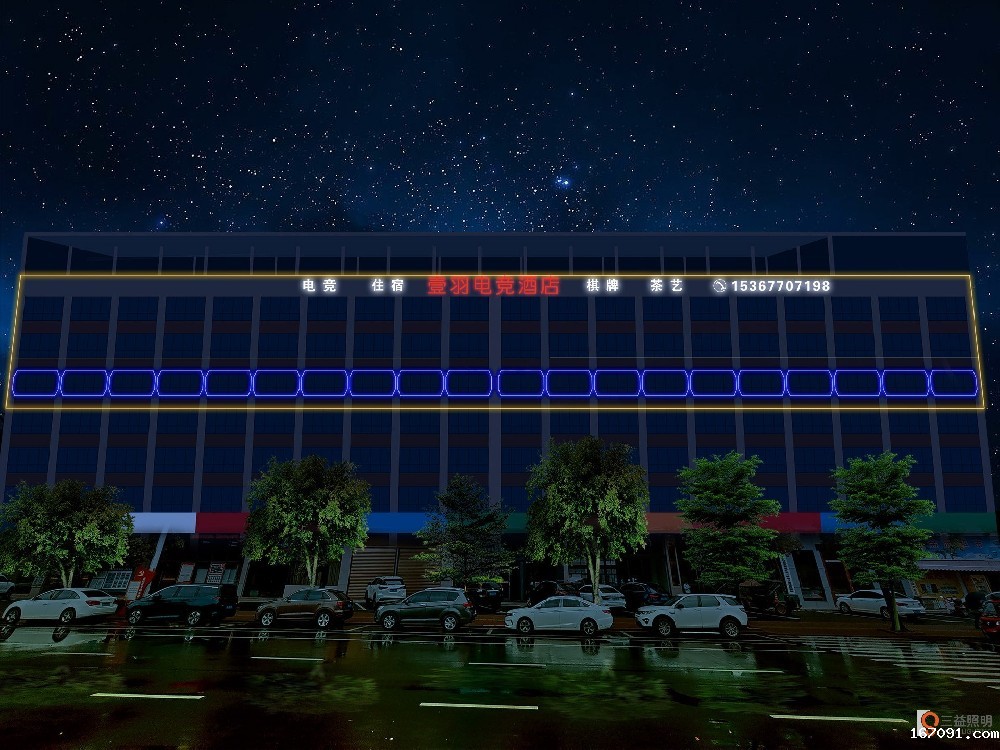益阳市益羽电竞酒店外墙灯光设计项目,本项目位于益阳市资阳区迎春北路。本项目设计采用LED发光字,LED线条灯,LED洗墙灯,LED投光灯等产品,对酒店外墙进行灯光亮化工程。