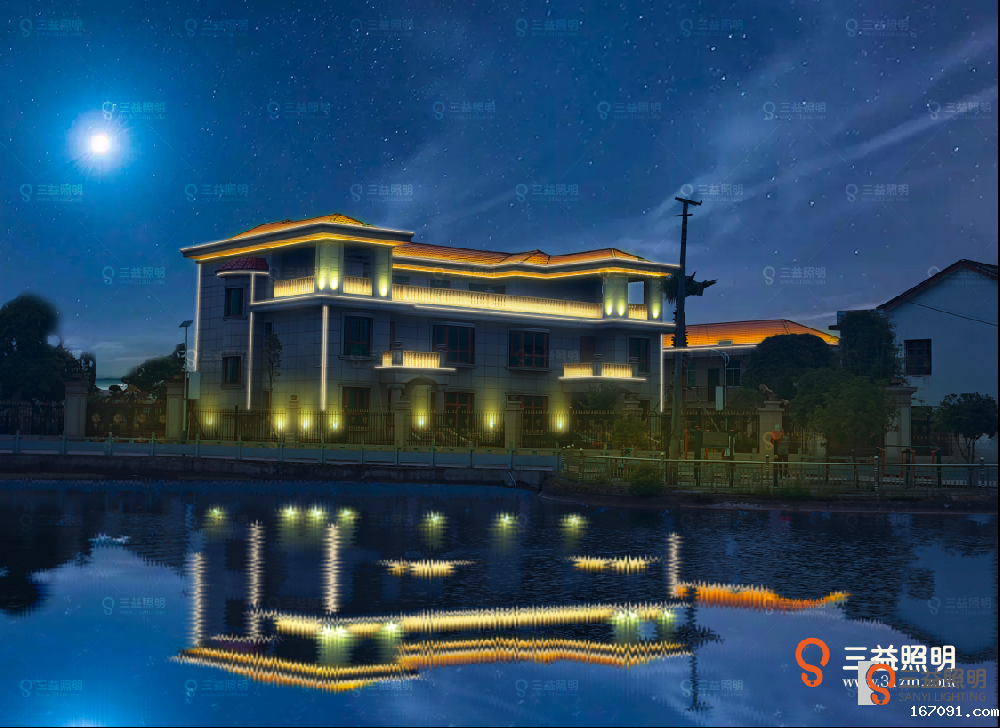 此别墅灯光根据别墅造型外观进行设计,使别夜晚墅轮廓更加突出,通过灯光的设计和布置,能够让别墅在夜幕中更加美观、气派,提升整体的视觉效果。